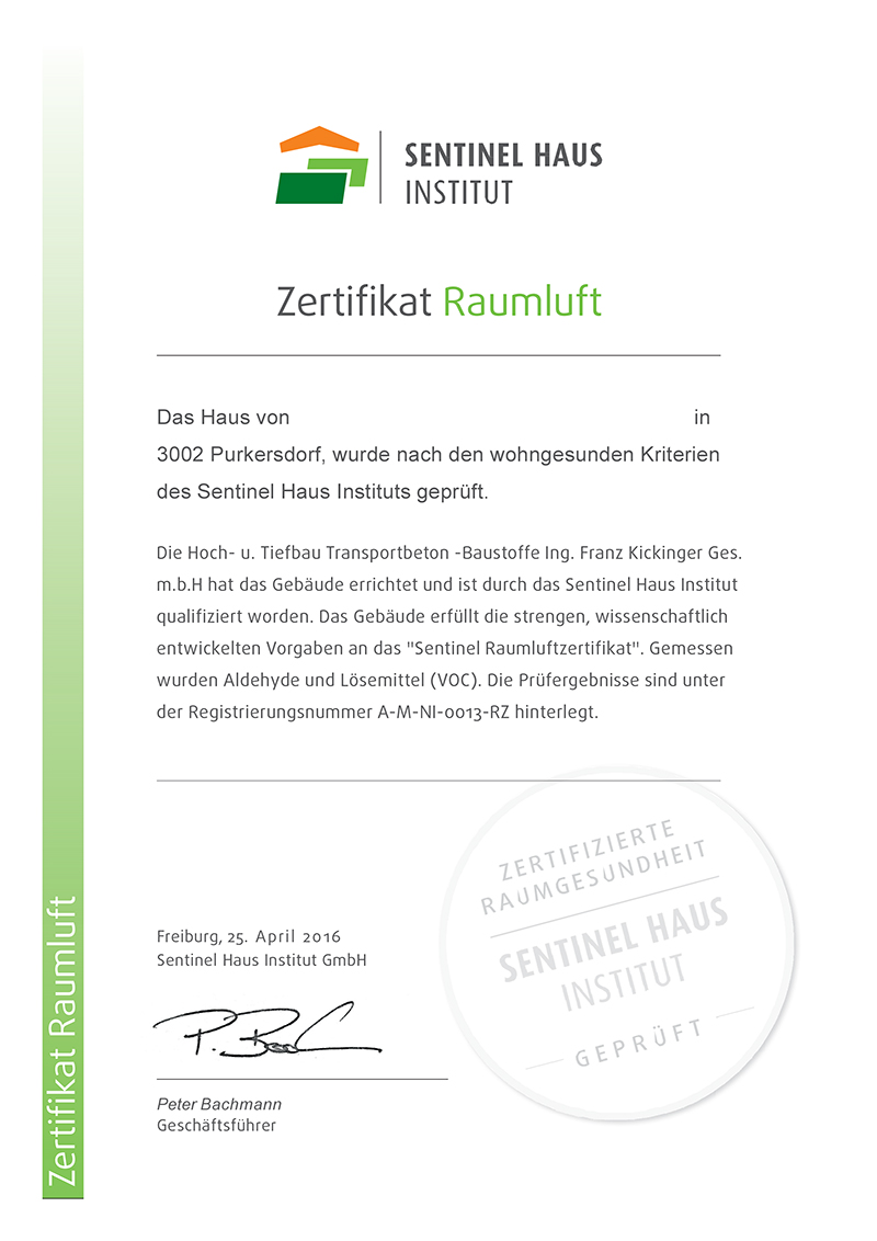 Wir bauen Häuser, die Ihre Gesundheit fördern. Mit dem Sentinel Raumluftzertifikat garantieren wir eine Innenraumhygiene nach den strengen Richtwerten der WHO.