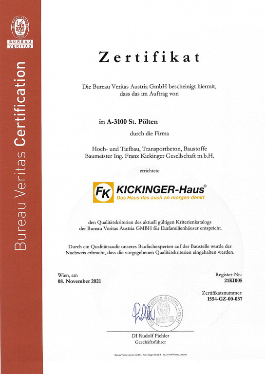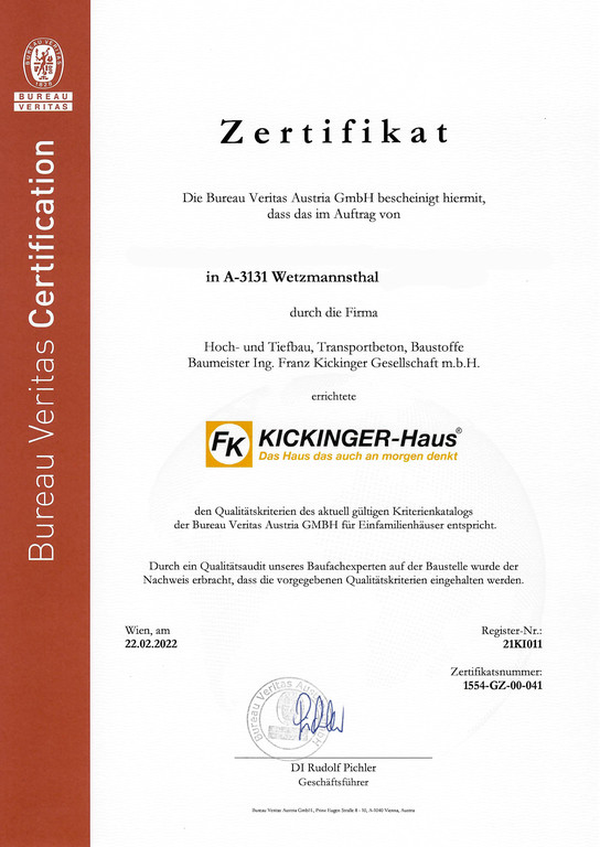 Zusammen mit der Bureau Veritas GmbH, dem weltweit größten Zertifizierungsunternehmen, unterziehen wir unsere Häuser einer neutralen Qualitätsüberprüfung. Ein unabhängiger Baufachmann kontrolliert die Baustelle je nach Ausbaustufe bis zu zwei Mal.