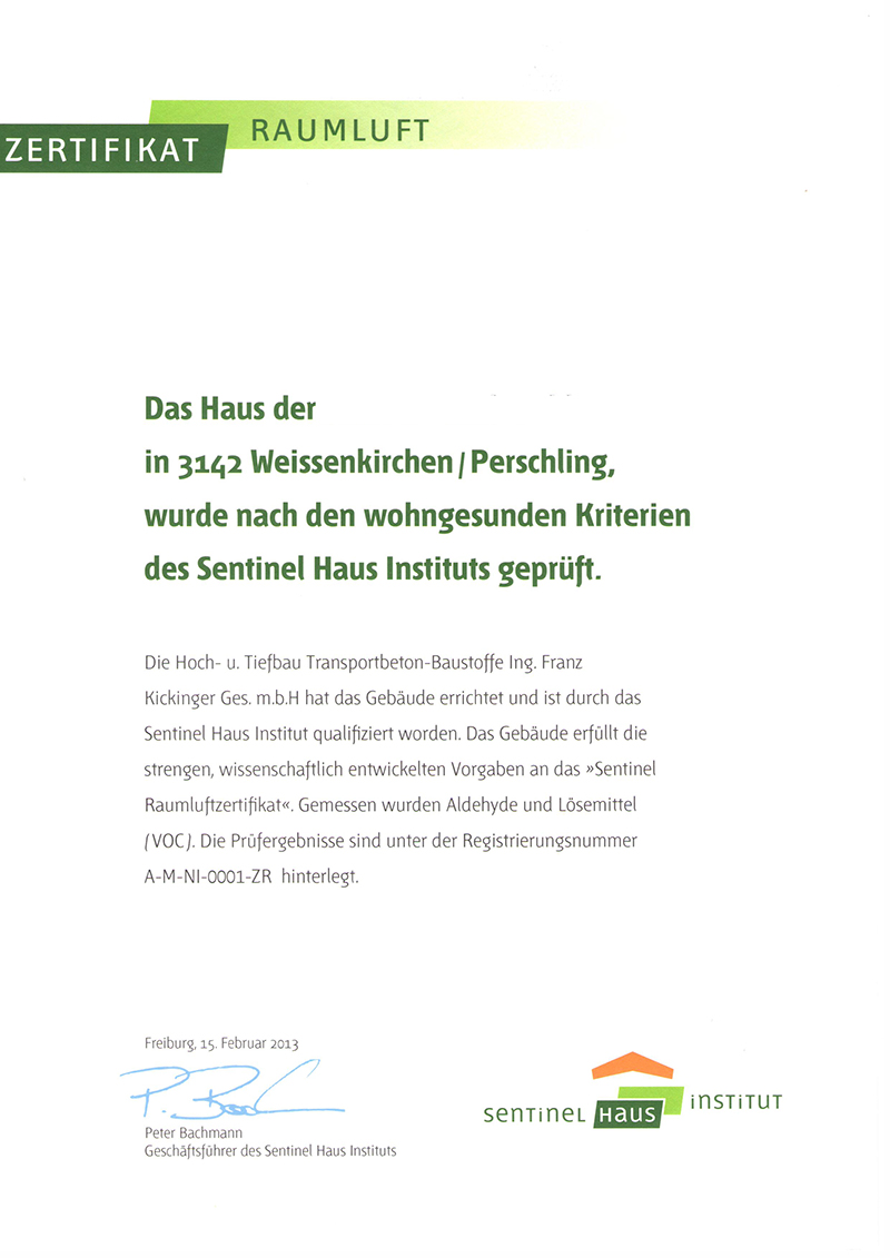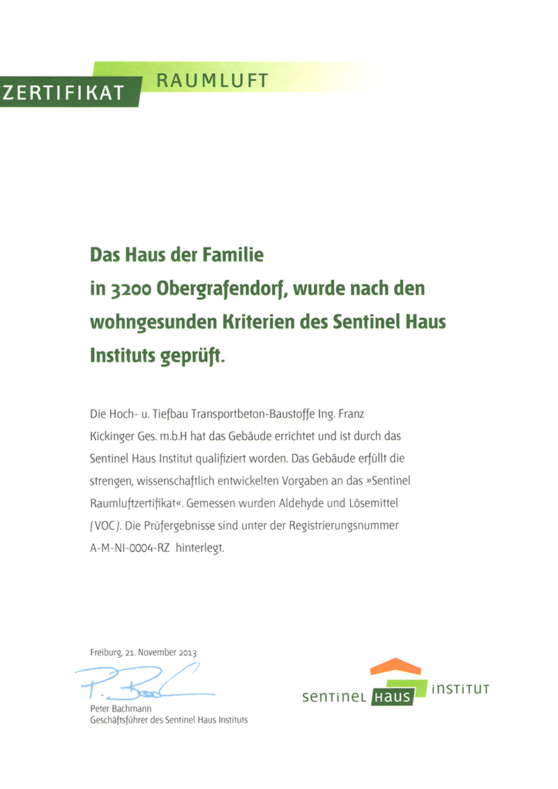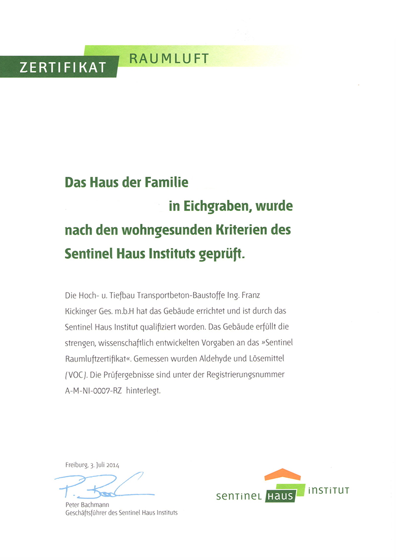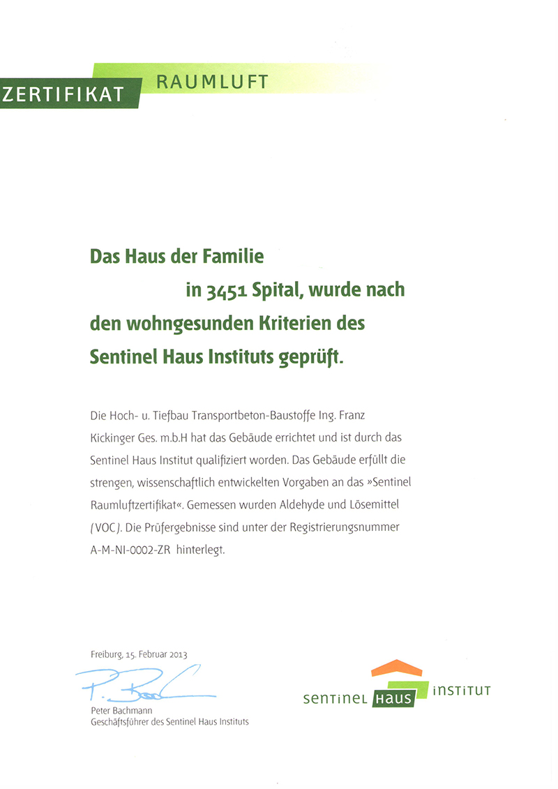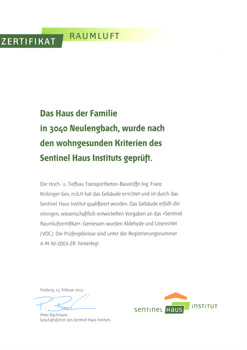 Wir bauen Häuser, die Ihre Gesundheit fördern. Mit dem Sentinel Raumluftzertifikat garantieren wir eine Innenraumhygiene nach den strengen Richtwerten der WHO.