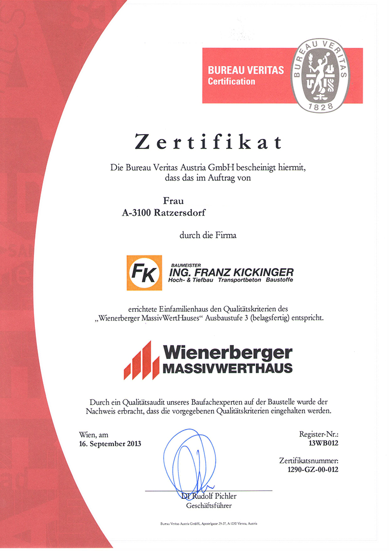 Zusammen mit der Bureau Veritas GmbH, dem weltweit größten Zertifizierungsunternehmen, unterziehen wir unsere Häuser einer neutralen Qualitätsüberprüfung. Ein unabhängiger Baufachmann kontrolliert die Baustelle je nach Ausbaustufe bis zu zwei Mal.